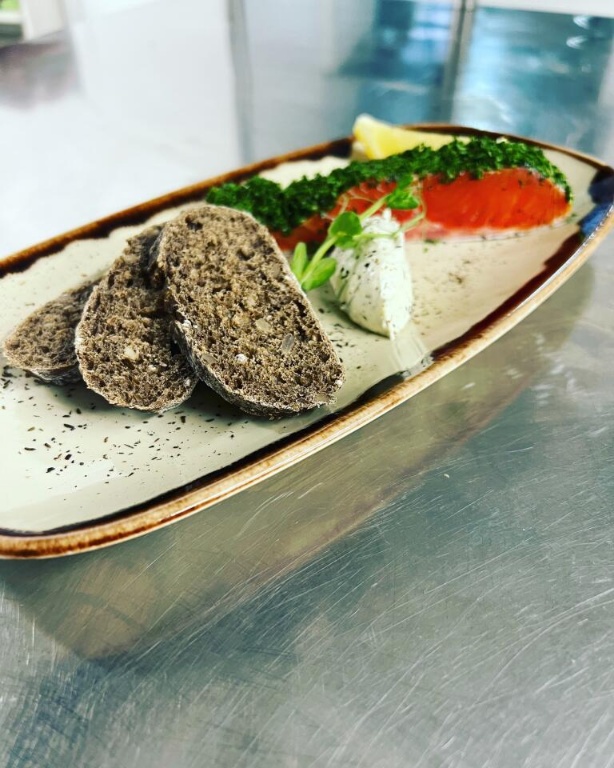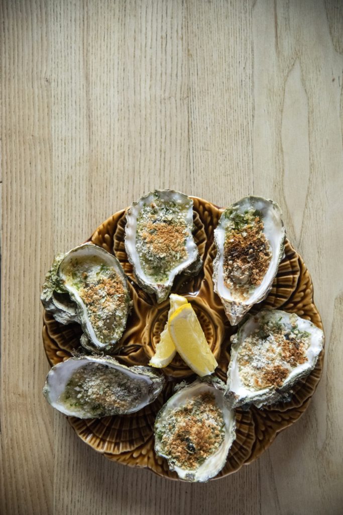 Grilled Oysters 6 Oysters Garlic Butter Bread Crumbs Tarragon Lemon to garnish Put on grill to heat up Arrange six opened oysters on a tray (pour out liquor) Put two tarragon leaves on each oyster small amount of garlic butter on each oyster cover with breadcrumbs Grill until breadcrumbs go golden
